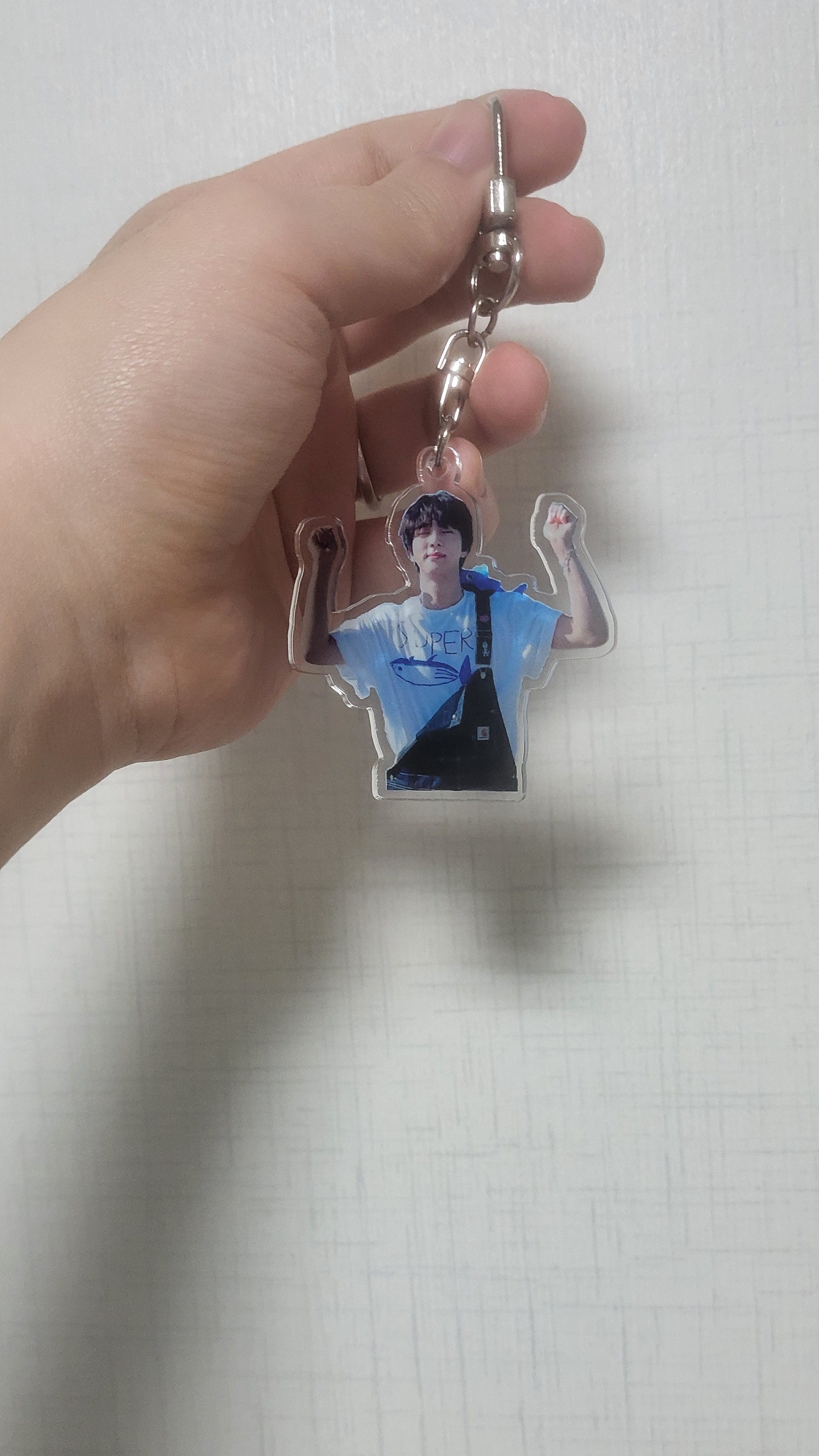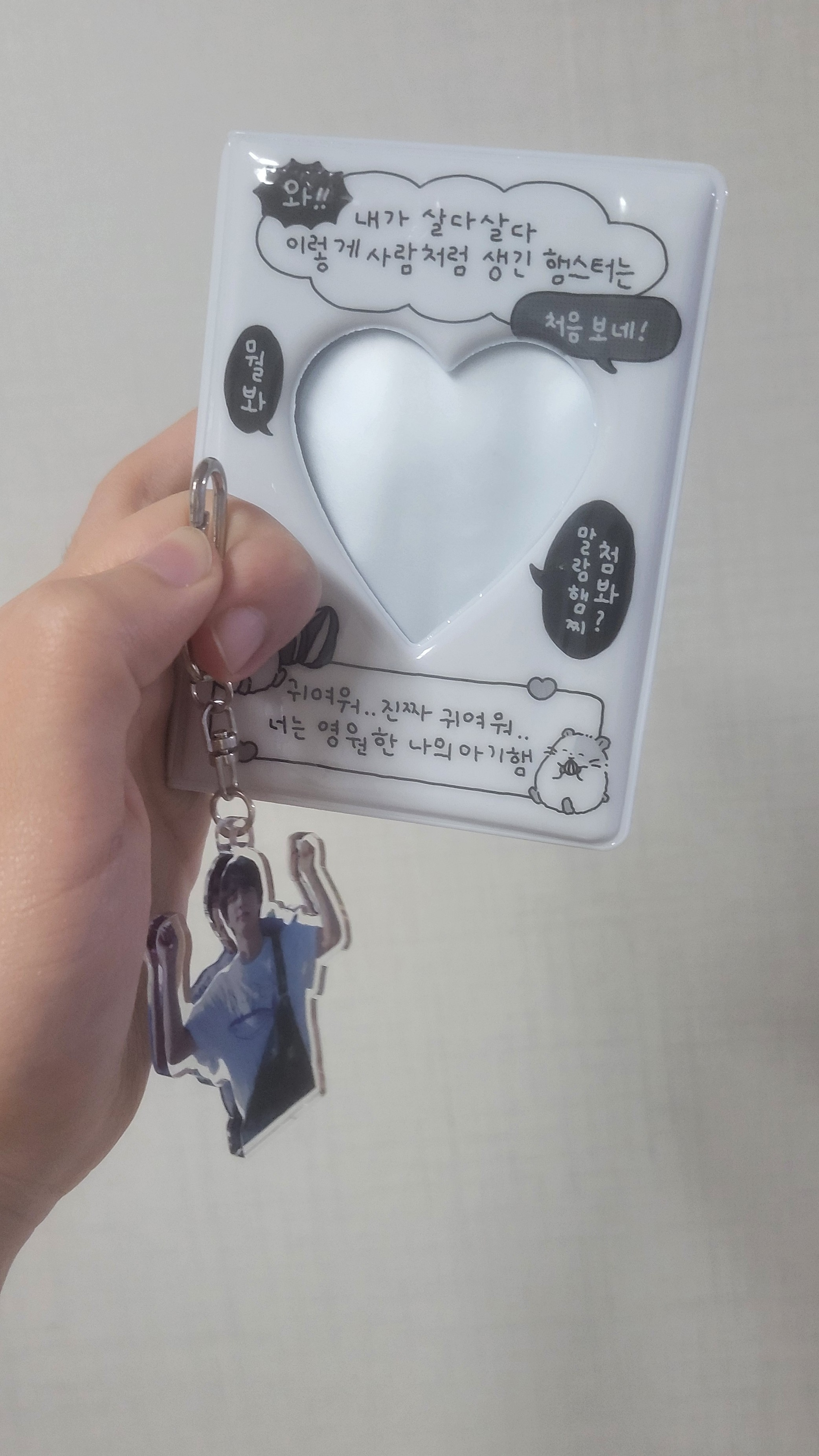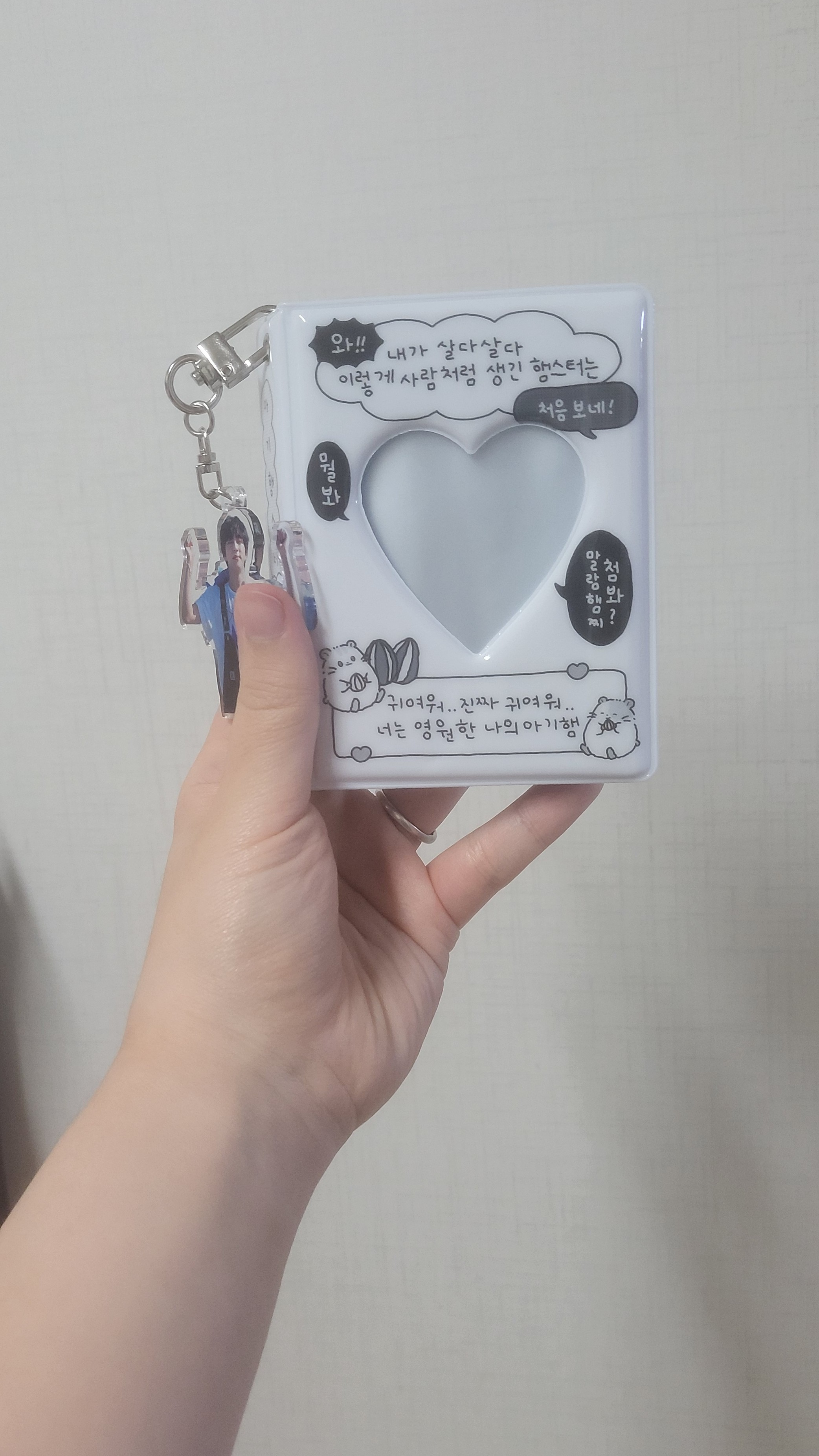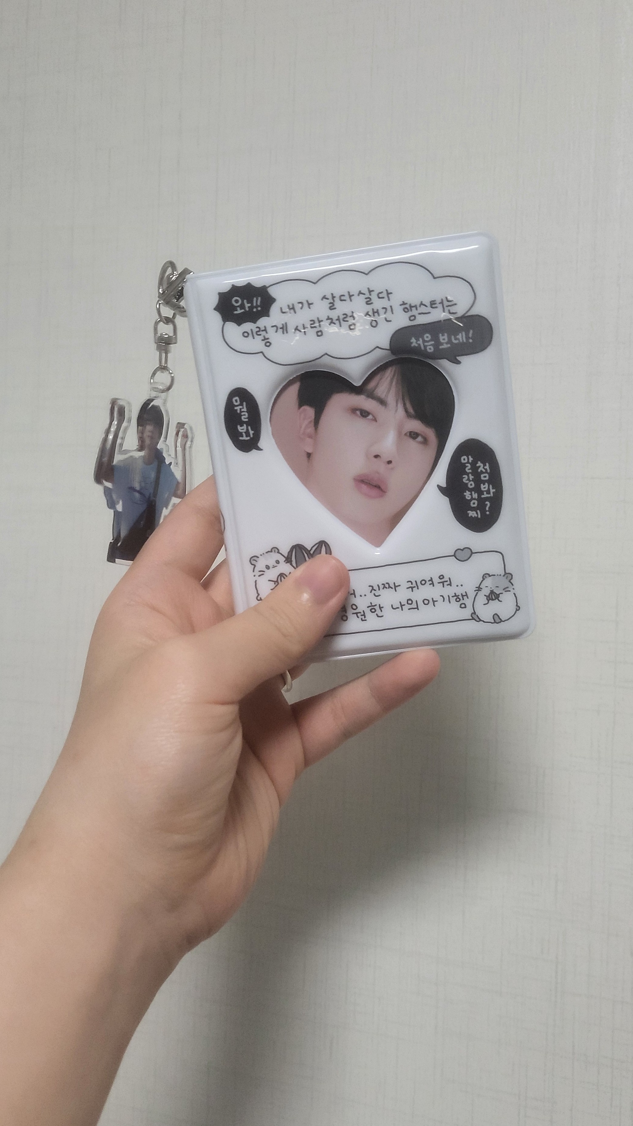 Saya membawa ini untuk dijadikan gantungan kunci di buku koleksi hamster bayi. Sebagai referensi, desain gantungan kunci ini adalah desain gantungan kunci Super Tuna Kim Seok-jin yang saya terima di Twitter beberapa waktu lalu.