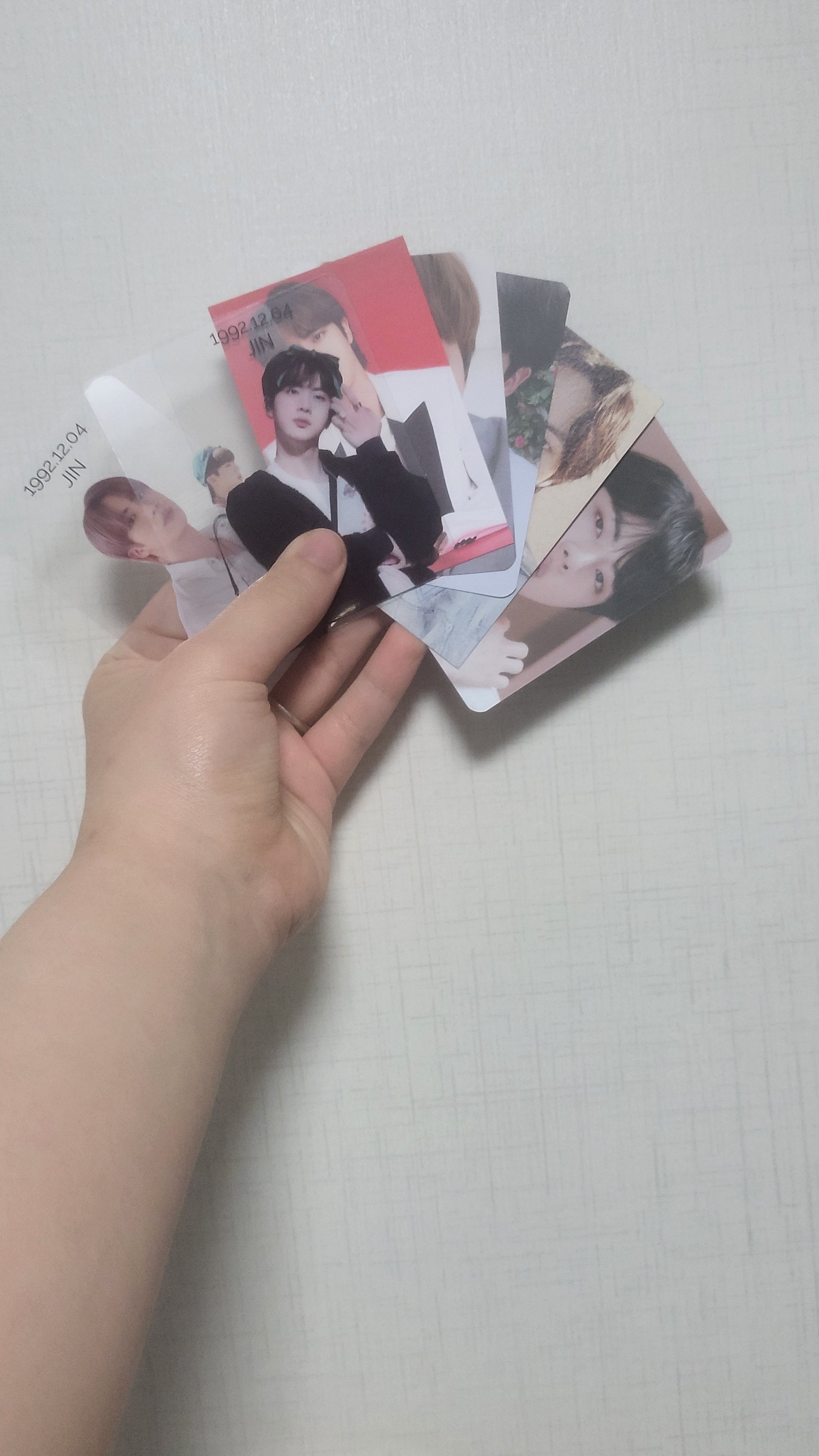 Aku mengeluarkan semua photocard di binderku karena kupikir akan terlalu sulit untuk memilih. Photocard yang kalian lihat di tanganku adalah photocard yang kudapatkan saat pergi ke kafe acara ulang tahun BTS. Sekarang aku akan memutuskan photocard mana yang akan kuletakkan di sampul depan.