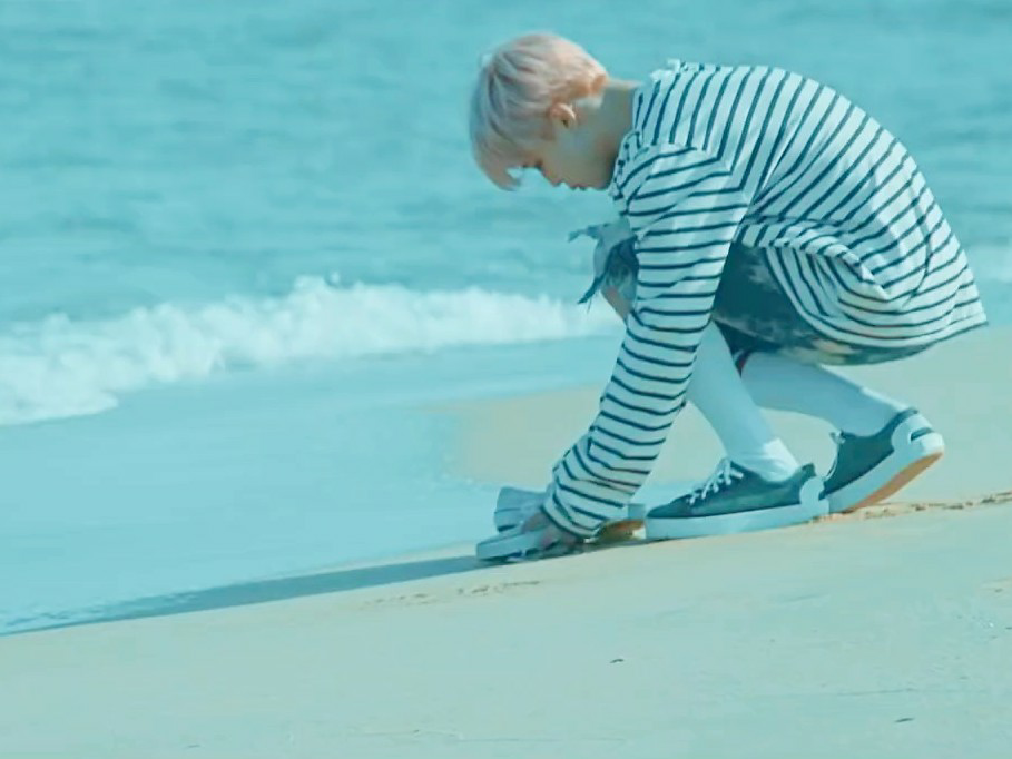 Jimin, che aveva iniziato a cercare il proprietario delle scarpe per sicurezza, vide una ragazza sdraiata sulla spiaggia non lontano da lì.