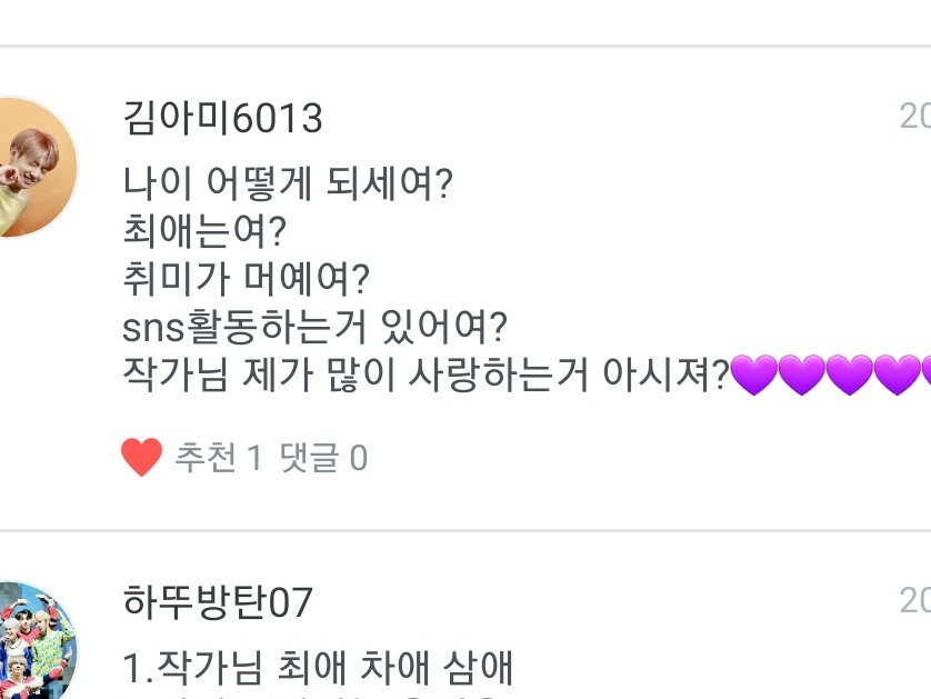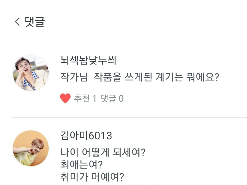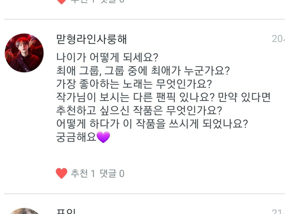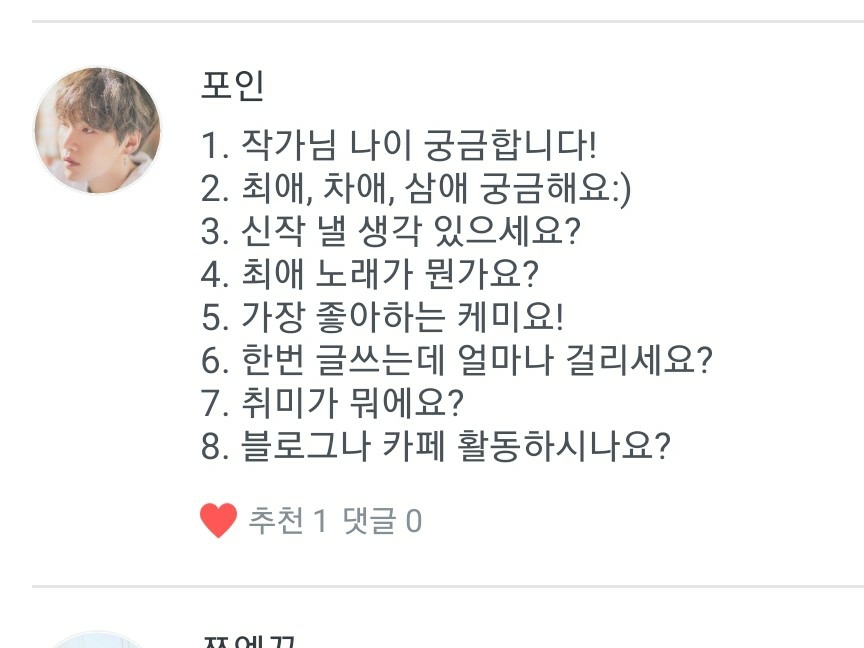 1. Indovina la mia età! 2. La mia preferita è Soap, la seconda è Jimin Oppa, e non ho terzi preferiti! 3. Ho già del materiale in mente per il nuovo lavoro... 4. La mia canzone preferita è Friend! 5. La mia chimica preferita è Soap! 6. Se ci vuole molto tempo per scrivere qualcosa,