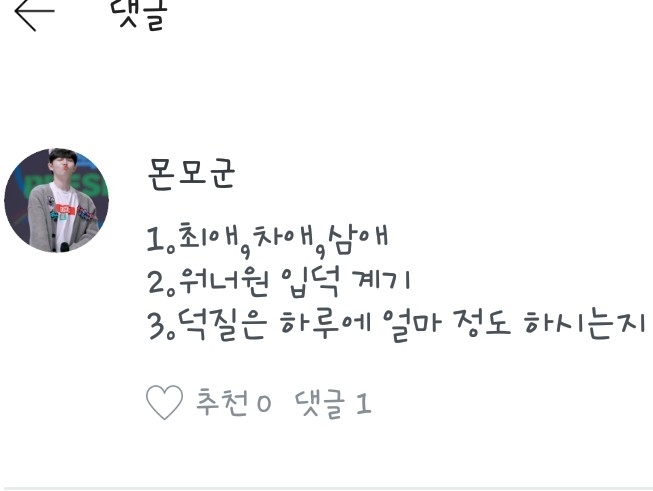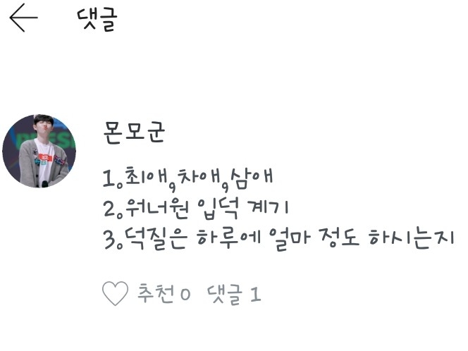 3.전..덕질을 틈만 나면 합니다..제가 시간이 남을 때 워너원을 덕질 하면서 팬픽을 써요!헷..어떻게 궁금증은 풀으셨나요?몬모군님 질문 남겨주셔서 감사합니다