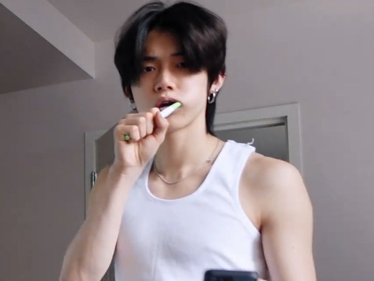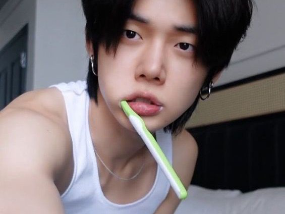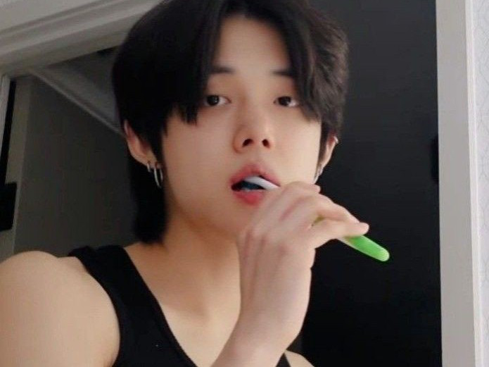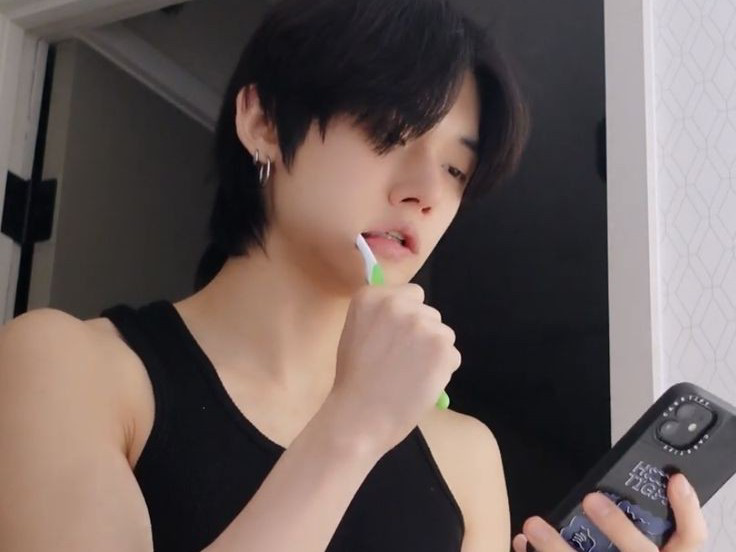 ヨンジュンは歯ブラシを噛み、急に私を振った。