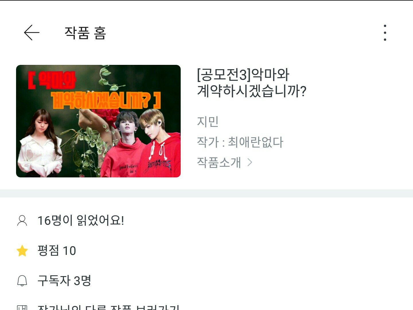 이번에 공모전에 도전할 작품은 신작임에도 제대로된 연제가 되지 않고 있었던 '악마와 계약하시겠습니까?'를 아직 연제되지 않은 뒷스토리를 수정하여 재연제할 생각입니다.