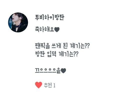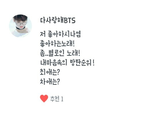 Tất nhiên rồi! / Cá nhân mình thích Outro: Tear~ / Mình nghĩ không có ai nổi bật nhất đâuㅜ Chắc là... không có ai cảㅜ / 1. J-Hope, 2. Jin, 3. Suga, 4. Jimin, 5. V, 6. Jungkook, 7. RM Đây là ý kiến cá nhân của mình và mình thích tất cả bọn họ~ Không phải là mình ghét Namjoon oppa đâu! / Hoseogi oppaㅜ Quá nhiều