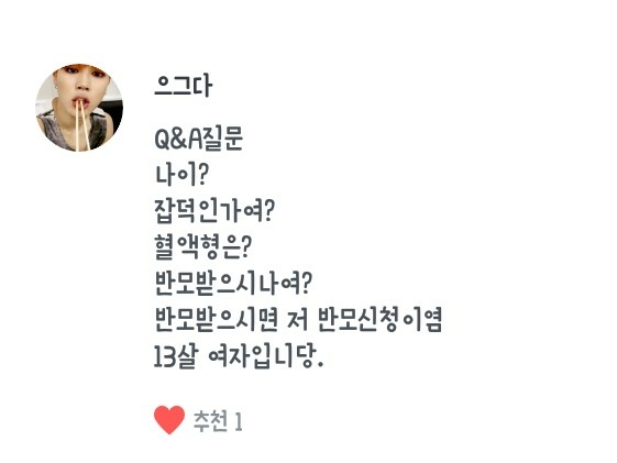 Mình 13 tuổi~/Mình không phải là fan hỗn tạp, mình chỉ là fan của BTS thôi!/Nhóm máu của mình là B!/Mình sẽ lấy một chiếc bánh hình bán nguyệt~/Làm bạn với mình nhé^~^