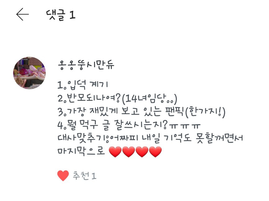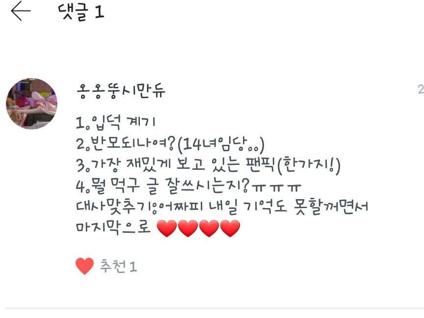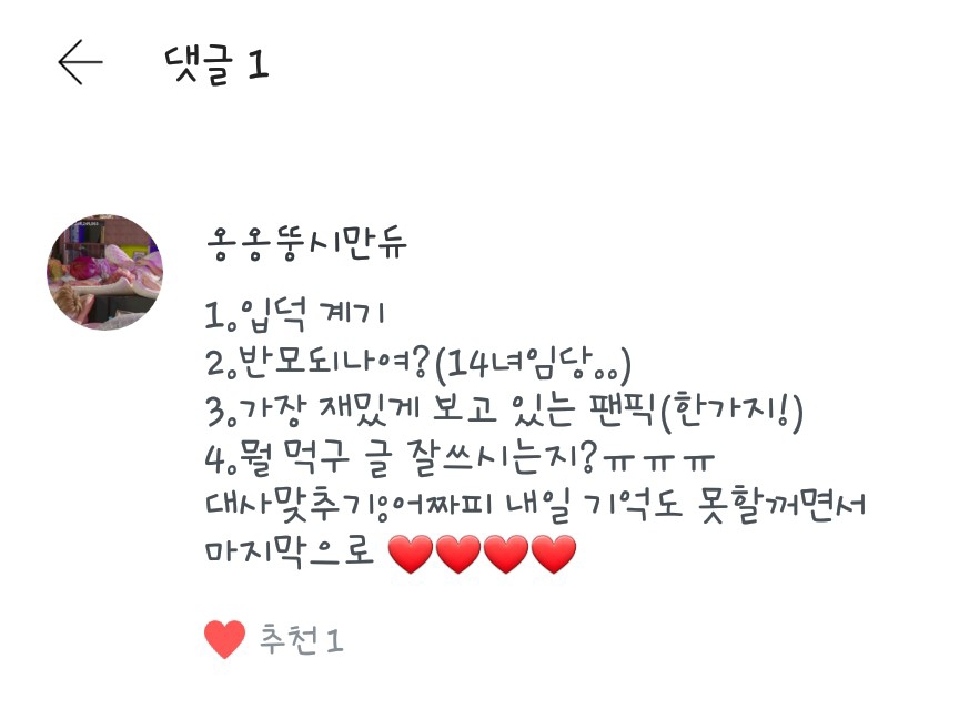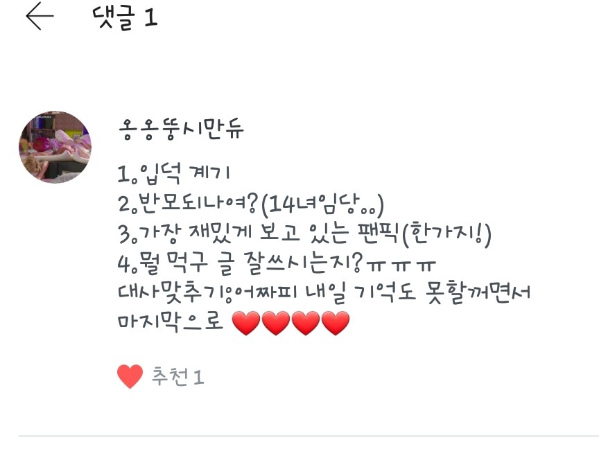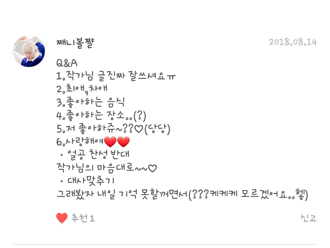 좋아하는 음식은 떡볶이구영 좋아하는 장소(?)는 집이영!! 째니볼짤님 좋아하죠❤❤ 저두사랑해요❤