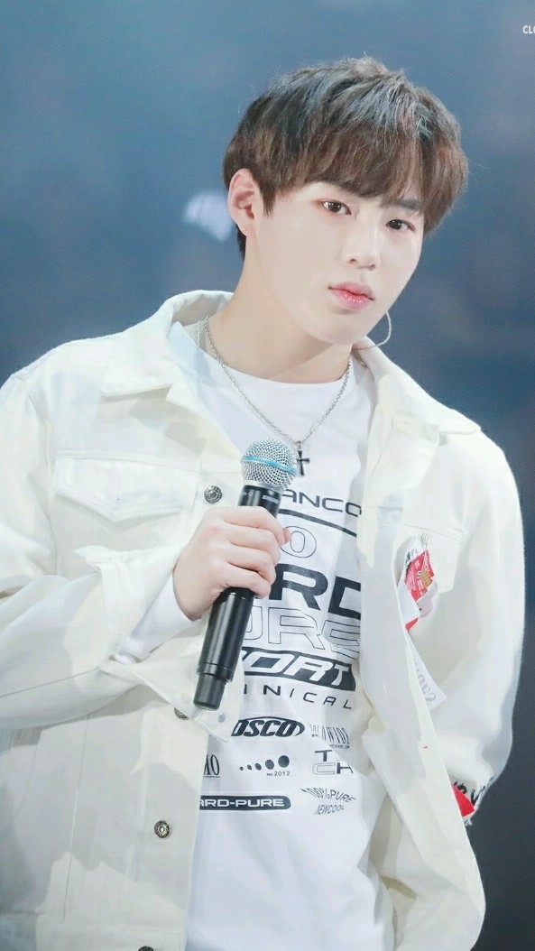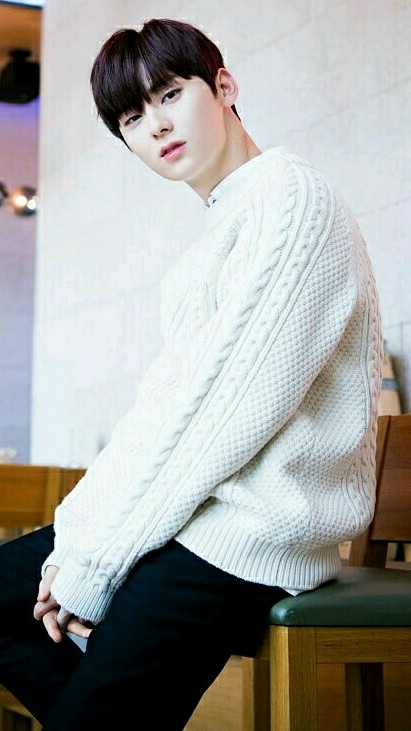 Minhyun đang đứng dựa vào tường.