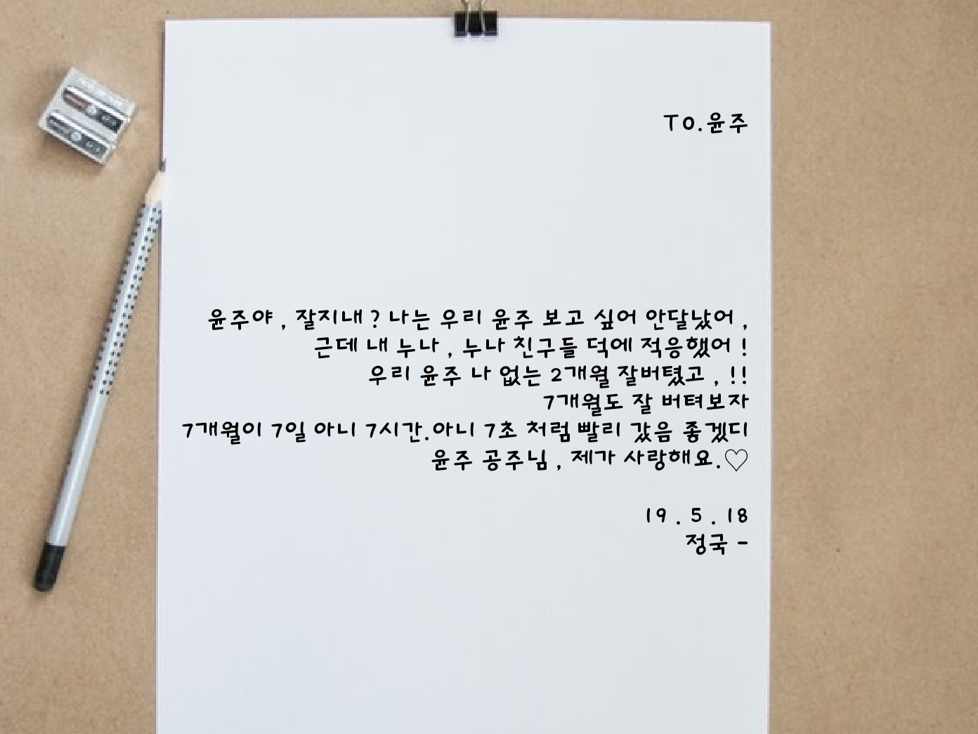 Gửi Yoonju: Yoonju, cậu khỏe không? Tớ nhớ cậu nhiều lắm, nhưng nhờ chị gái và bạn bè của chị ấy mà tớ cũng quen rồi! Yoonju, cậu đã vượt qua hai tháng không có tớ rồi đấy!! Chúng ta hãy cùng nhau vượt qua bảy tháng tiếp theo thật tốt nhé. Bảy tháng trôi qua nhanh quá, như bảy ngày, không, bảy giờ. Không, bảy giây.