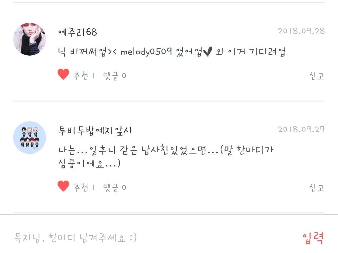 Tobidubap Yejiapsa-nim♡ - Tớ cũng vậy.. Trong số tất cả các cô gái, tớ lại có bạn trai..X Yejuri68-nim♡ - Aha! Tớ xin lỗi vì không bắt kịp cậu sớm hơn..ㅜ Biệt danh của cậu dễ thương quá♡