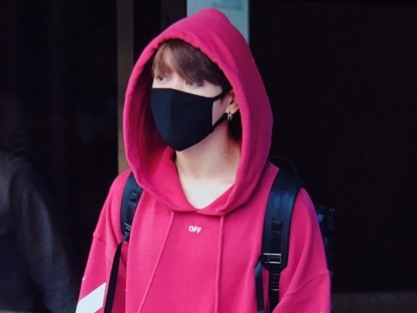 Jungkook xuất hiện trong bộ áo hoodie và khẩu trang.