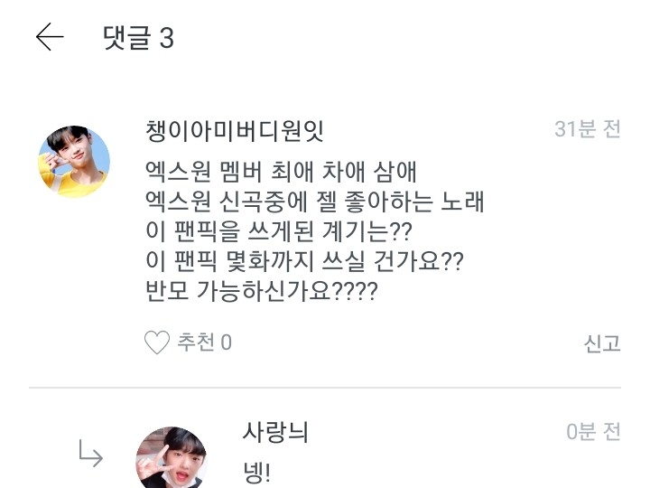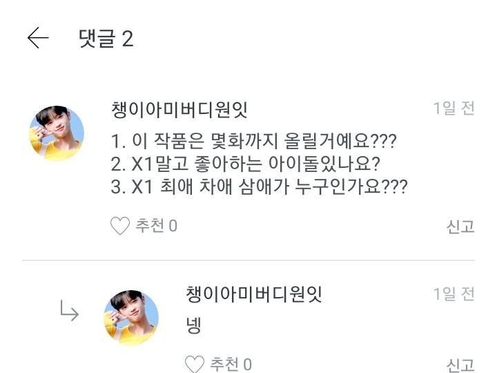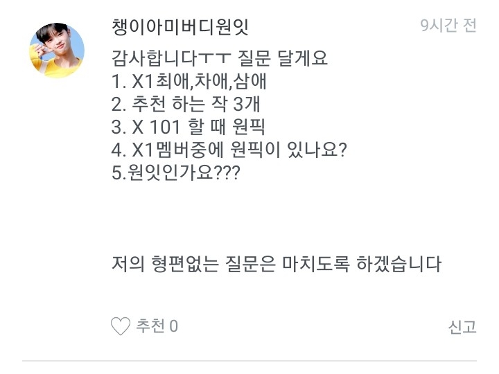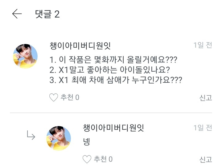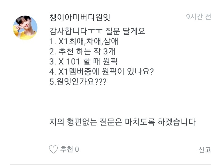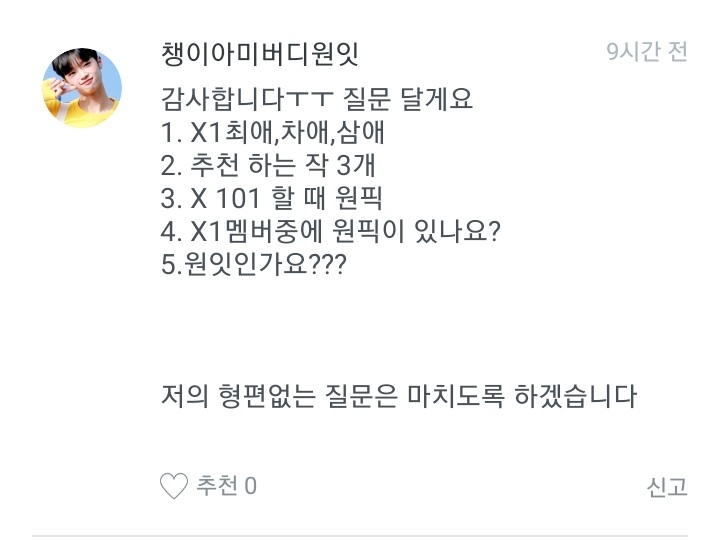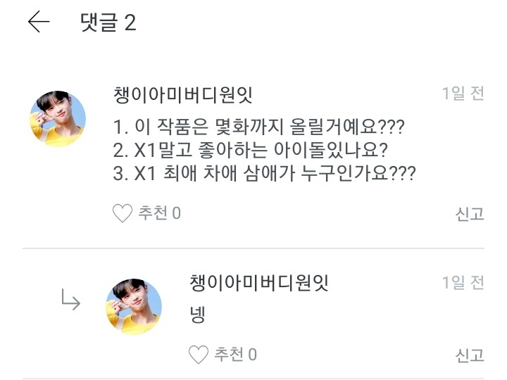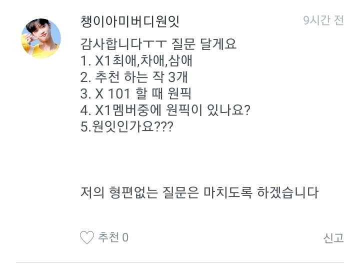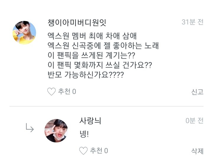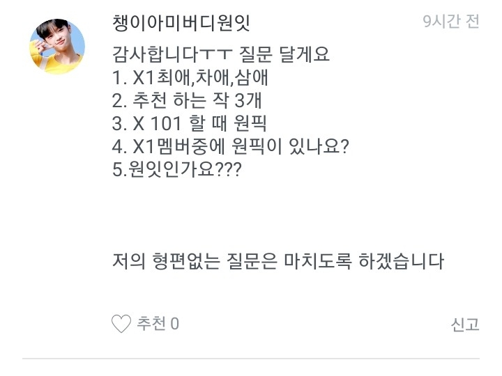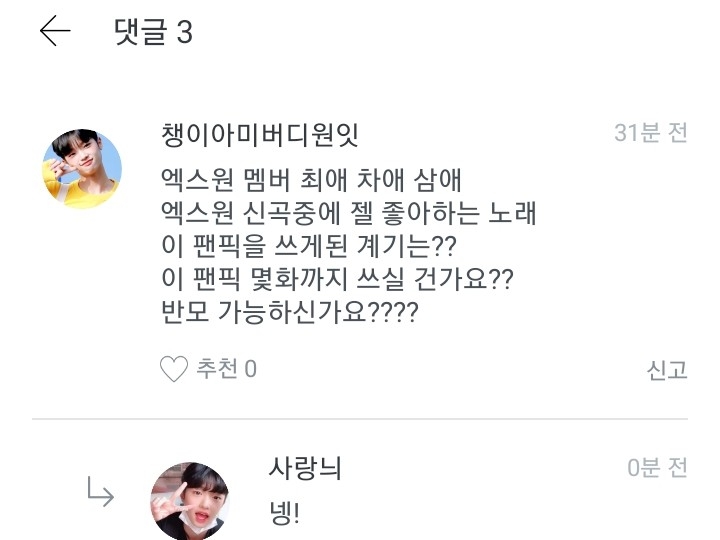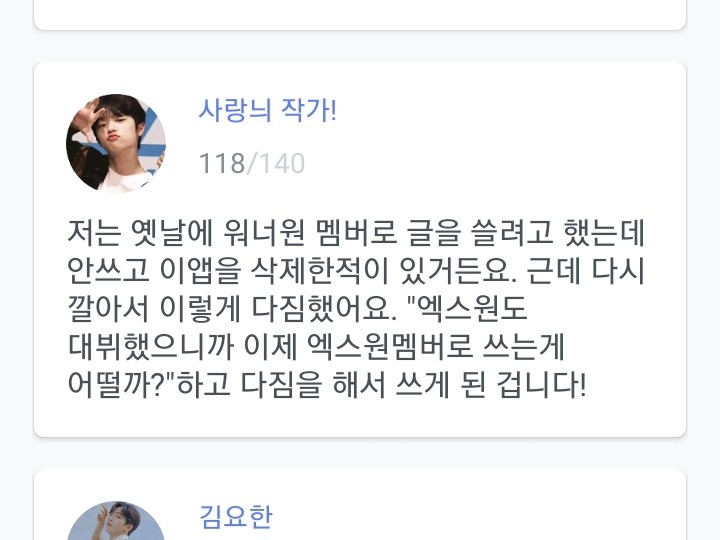 저는 옛날에 워너원 멤버로 글을 쓸려고 했는데 안쓰고 이앱을 삭제한적이 있거든요. 근데 다시 깔아서 이렇게 다짐했어요. "엑스원도 대뷔했으니까 이제 엑스원멤버로 쓰는게 어떨까?"하고 다짐을 해서 쓰게 된 겁니다!