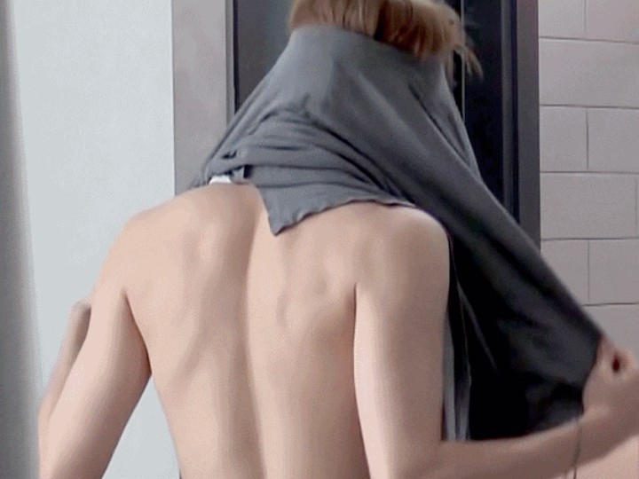 我当时正在用绷带包扎肚子,然后我摆出了一个奇怪的向后抱的姿势,所以我赶紧把绷带包扎好了。