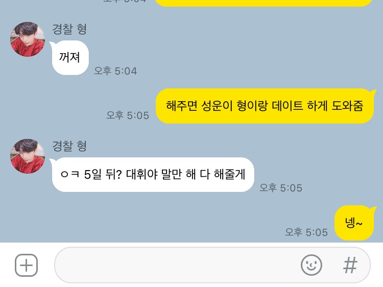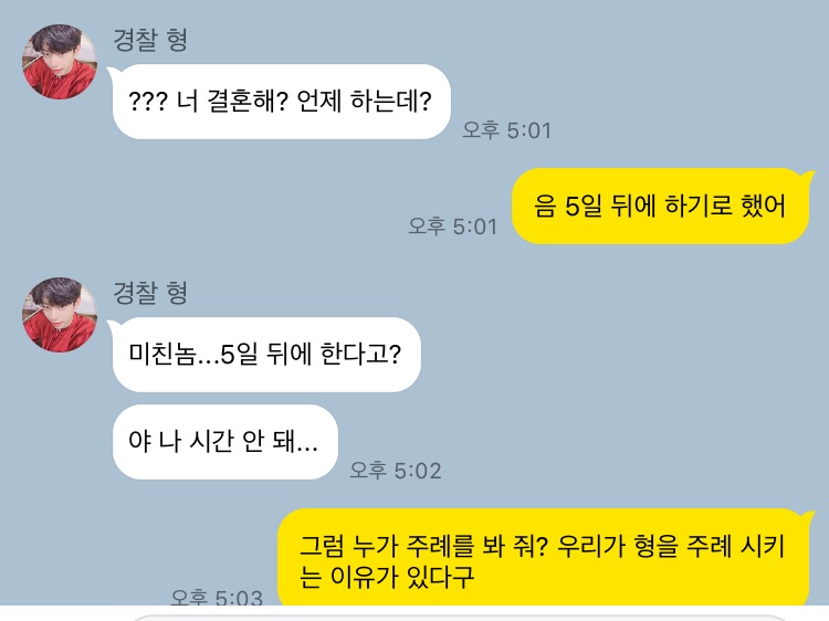 嗯……东贤哥,就这么办吧。他看起来就算你让他说什么他也不会说什么,而且他是我认识的最随和的人。也是他把我们聚到一起的,对吧?哈哈哈