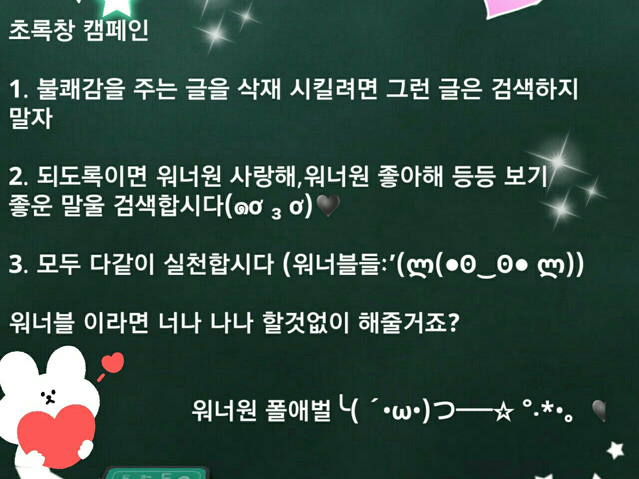 大家好,今天我来宣布一件事(ू˃̣̣̣̣̣̣︿˂̣̣̣̣̣̣ ू) 大家都知道“绿窗事件”吗?BTS、Wanna One 和其他一些偶像也受到了影响,所以我加入了“绿窗行动”ヾ(๑╹◡╹)ノ” 所以