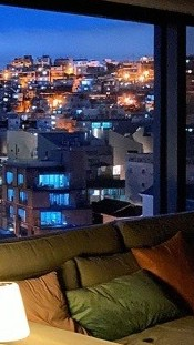 外面天色已黑,只有窗外城市燈光閃爍。