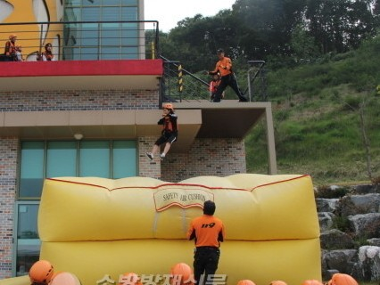消防隊長:孩子,現在你要跳到墊子上。跳的時候,想著屁股著地。萬一你咬到舌頭,就用毛巾塞住嘴巴。明白我的意思嗎?